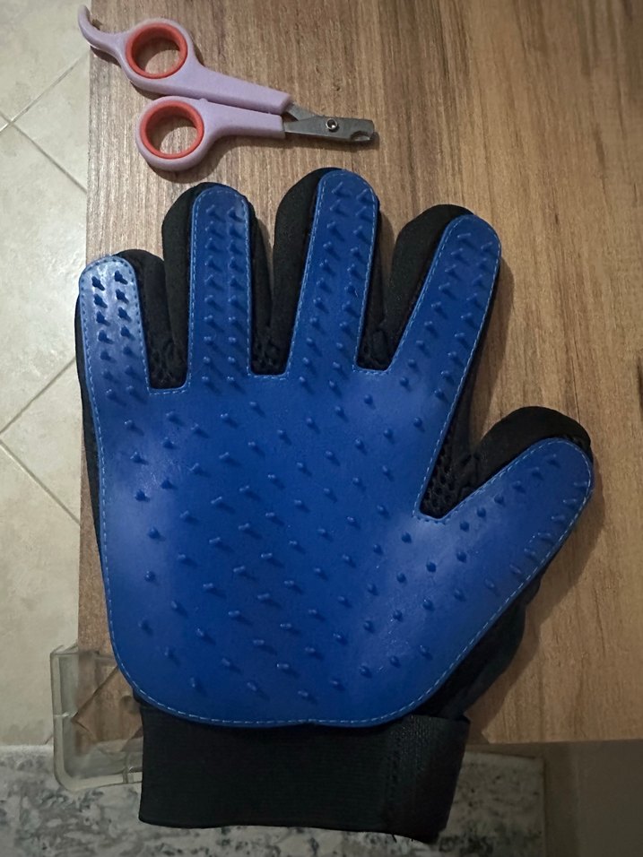 Kedi tüylerini toplamak için koyu mavi, yumuşak lastik uçlu ve ayarlanabilir bilek bantlı eldiven.Tırnak makası ikiside hic kullanılmadı