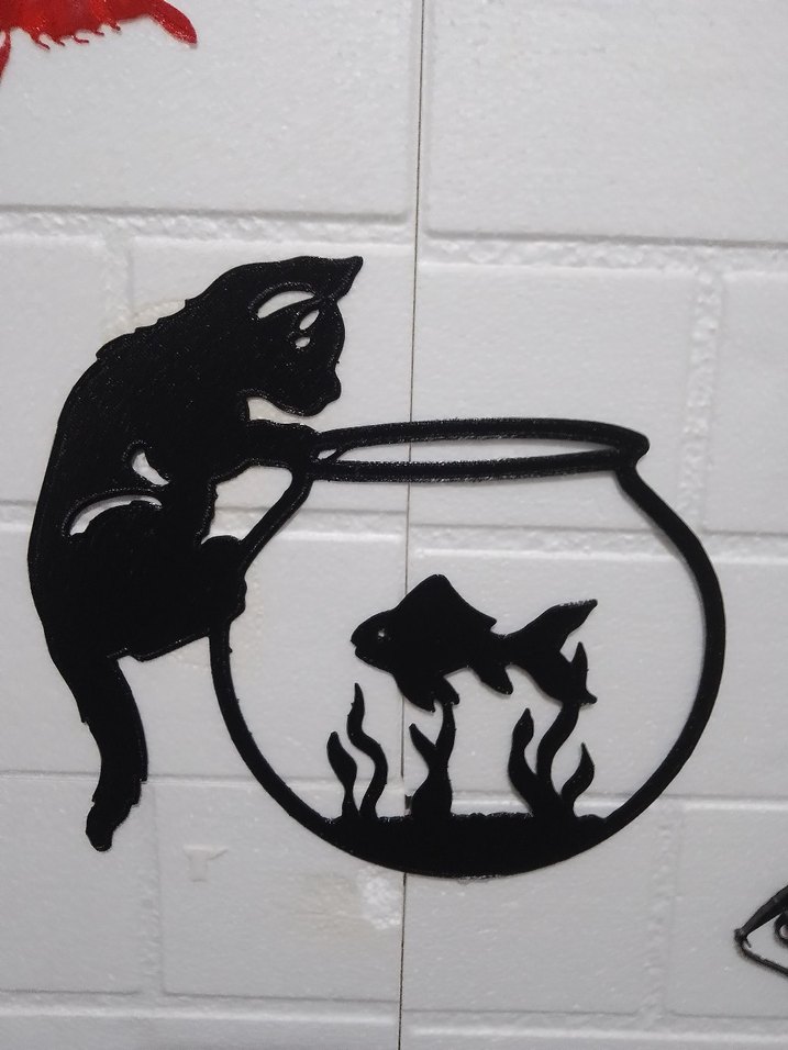 Kedinin akvaryumda yüzen balığı izlediği siyah duvar süsü.