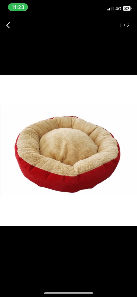 Aldık kedimiz hiç yatmadı sıfır duruyor Kırmızı dış yüzeyli ve bej iç kısımlı yumuşak, peluş kedi yatağı, konforlu bir dinlenme alanı sunar .