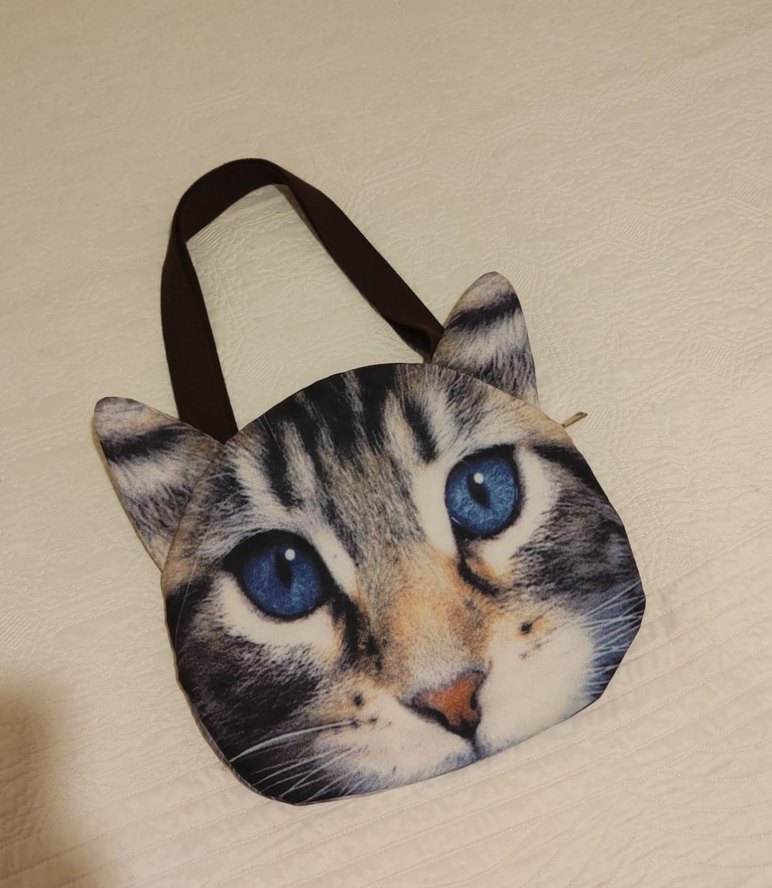Mavi gözlü gerçekçi kedi yüzü desenli, gri ve kahverengi tonlarda fermuarlı çanta. Taşıma için basit askısı bulunur. İçi de fermuarlı ve ceplidir.