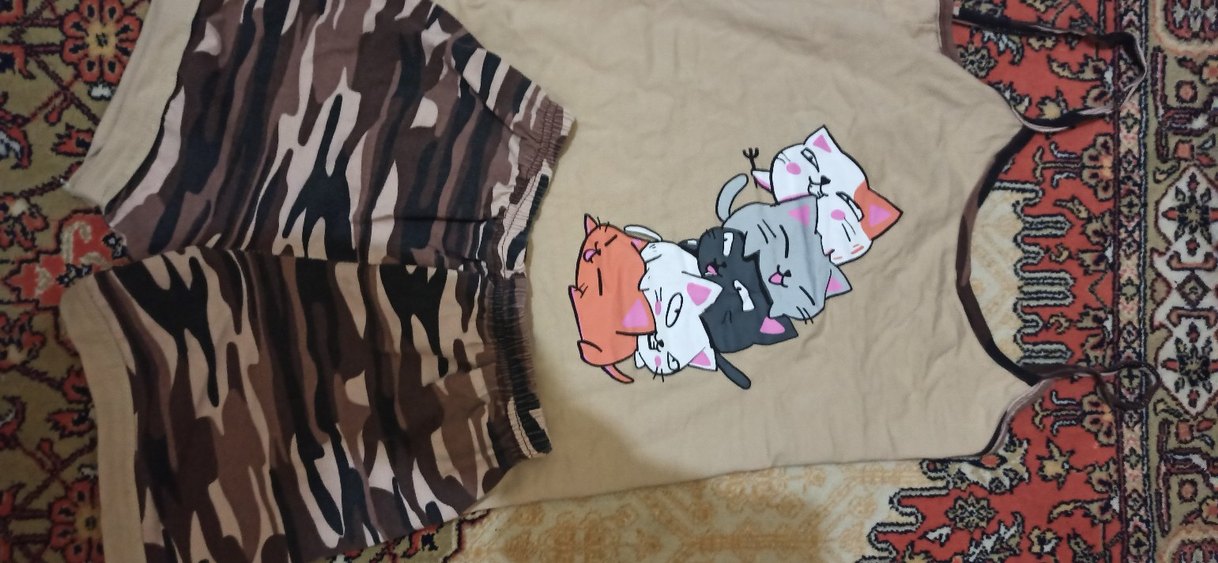 Pastel kahverengi şirin kedicikler kamufılaşlı şotlu pijama takımı 2 kez kullanıldı