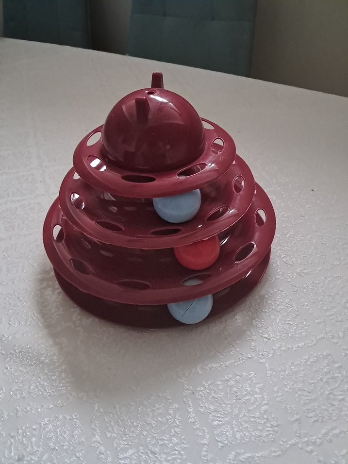 Kediler için içinde toplar bulunan çok katmanlı kırmızı oyuncak.