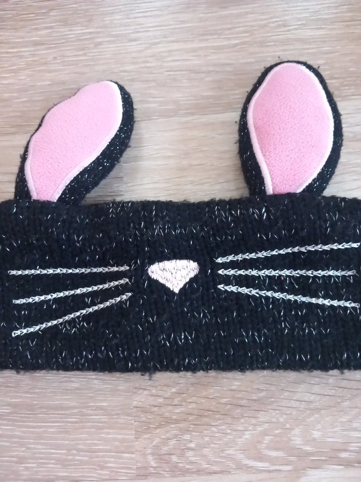 Koyu gri örgüden yapılmış, pembe iç kulakları ve nakışlı bıyıkları olan tavşan görünümlü kedi aksesuarı.