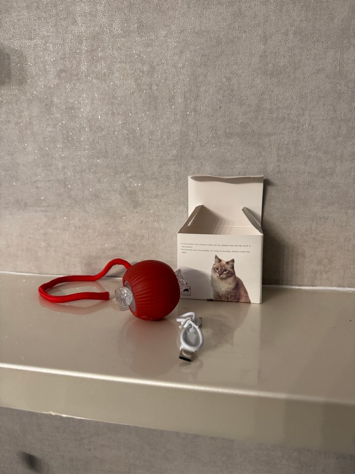 Kediler için kırmızı renkli, kayışlı oyuncak top. usb ile sarj oluyor