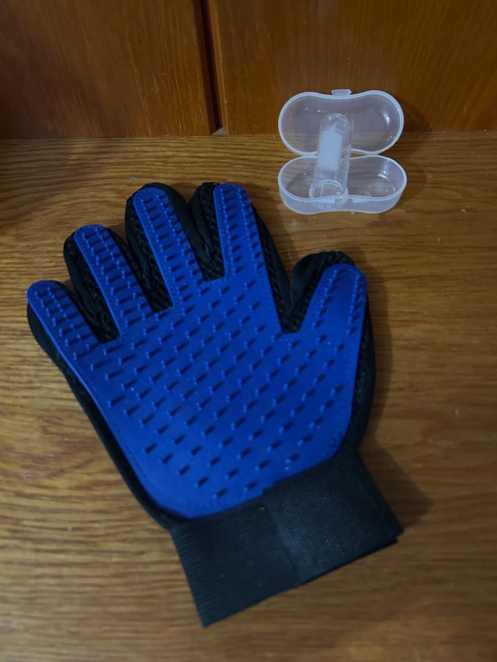 Kediler için mavi tımar eldiveni, plastikten yapılmış, cırt cırtlı bantlı, kolay tüy temizliği sağlar. Küçük şeffaf kutu diş fırçası ile birlikte.