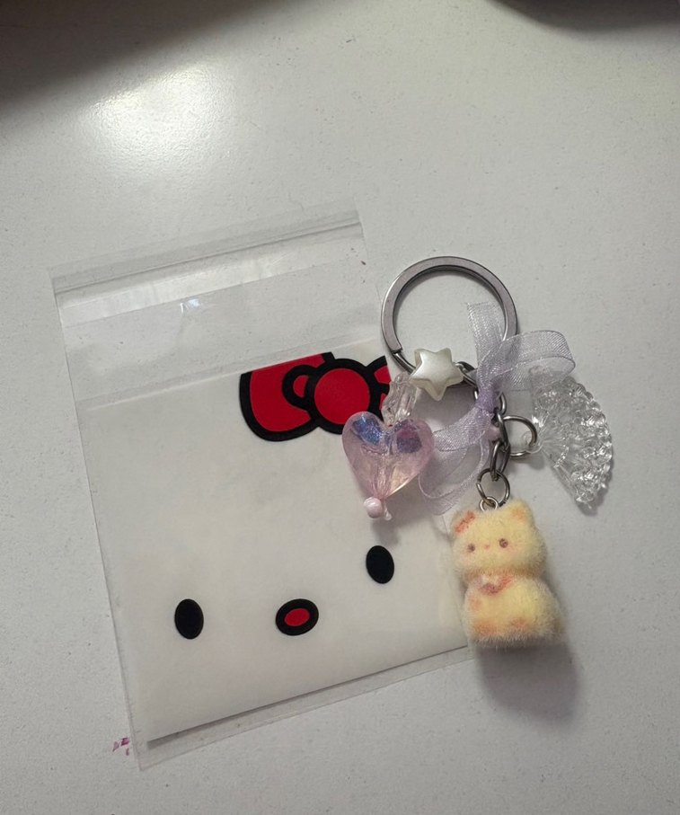 Boncuklu, renkli kadın anahtarlığı; yumuşak beyaz ayıcık, yıldız ve şeffaf kanat figürleriyle kurdeleye bağlı.