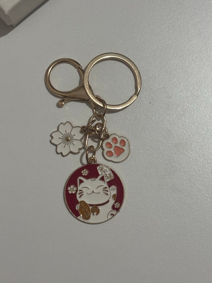 Altın renkli, püsküllü bohem tarzda, şans kedisi figürlü, pati ve çiçek detaylı renkli anahtarlık.