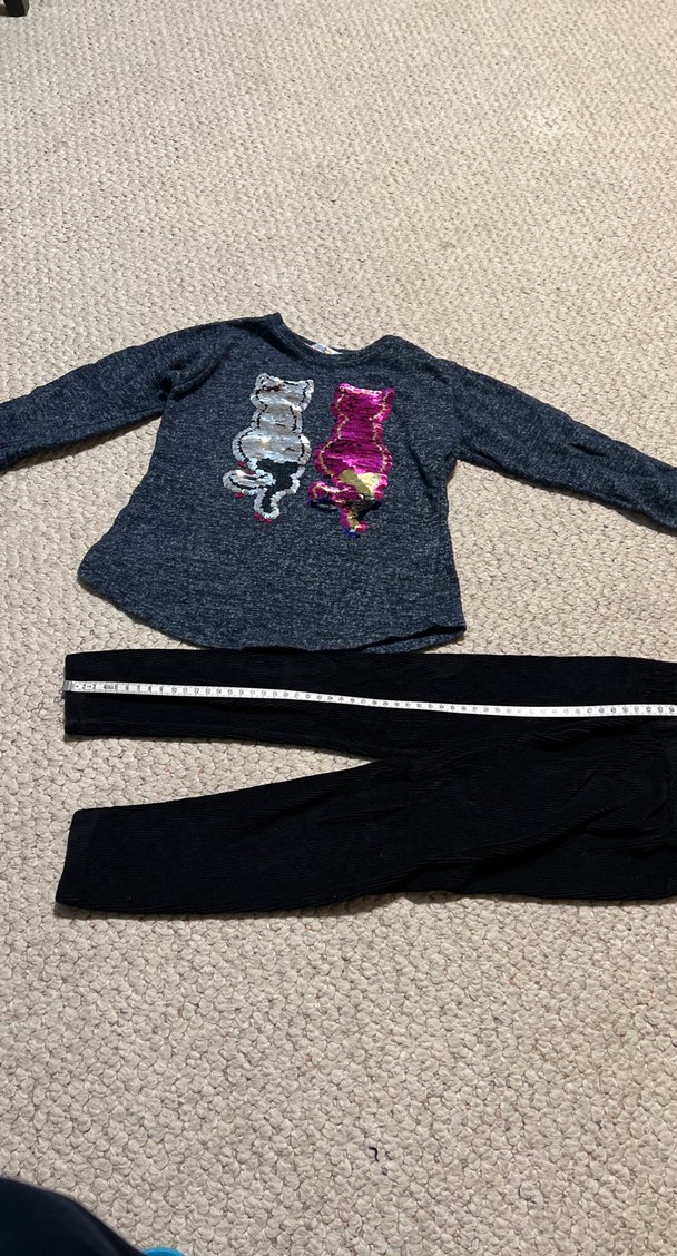 Örgü uzun kollu gri üstü renkli kedilerle baskılı, koyu renk taytla bebek kız takımı. Rahat ve şık günlük kullanım için.