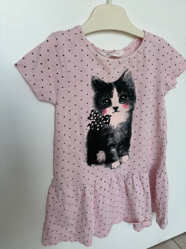 Pembe renkli kız elbisesi, kısa kollu ve yuvarlak yakalıdır. Pamuk kumaştan üretilmiş, baskılı kedi deseni ve fırfırlı etek ucu detayı vardır.