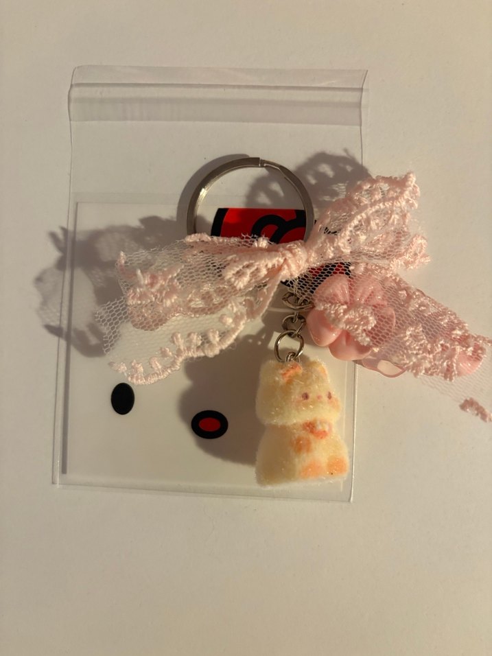 Pembe renkte, dantel detaylı ve yumuşak bir figürden oluşan anahtarlık, rahat ve yenilikçi tarzı bir araya getirir.