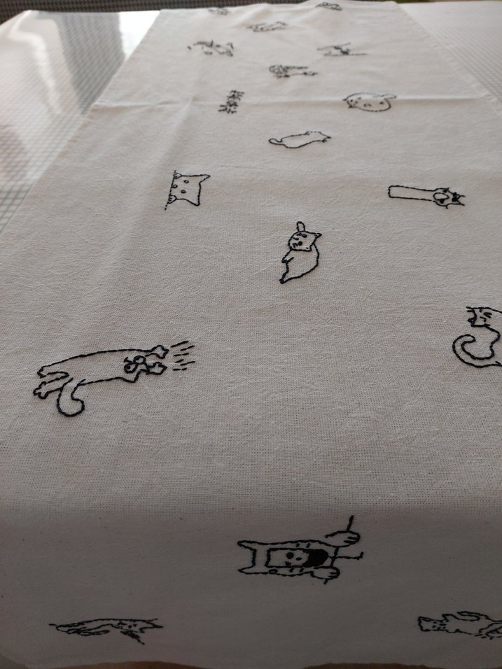 Cesitli kedi figurleri işlenmiş keten runner. Ürun islemeleri bana aittir . tamamen el yapimi 40×150 cm