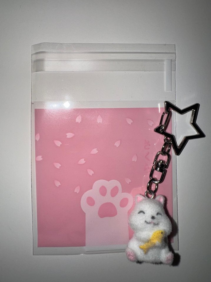Yıldız şeklinde bir anahtarlığa sahip tüylü tatlı bir kedi...Ağzında balık tutuyor.