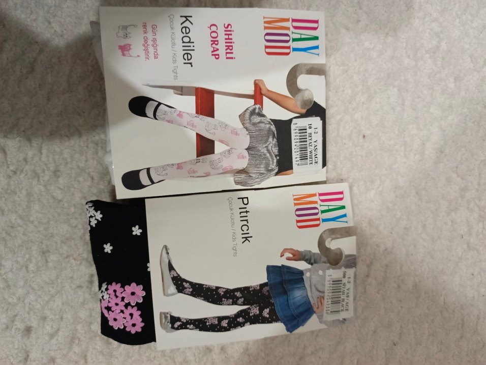 Pembe ve gri renklerde, kedili ve çiçekli desenlere sahip, yumuşak sentetik kumaştan çocuk külotlu çoraplar. Eğlenceli desenler içerir.