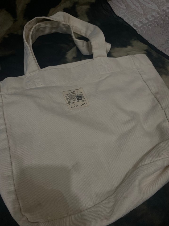 Beyaz pamuk kumaştan, krem baskılı kadın çantasıdır. Günlük sokak stili için sade ve temel tasarıma sahiptir. hiç kullanmadım dolapta leke olmuş fakat yıkama ile çıkar ✨