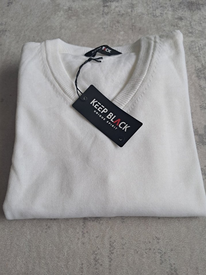 Keep Black markalı beyaz, pamuklu, uzun kollu ve yuvarlak yakalı kazak. Örgü dokusu ve bol kesimiyle rahat, günlük sokak stili için uygundur.
