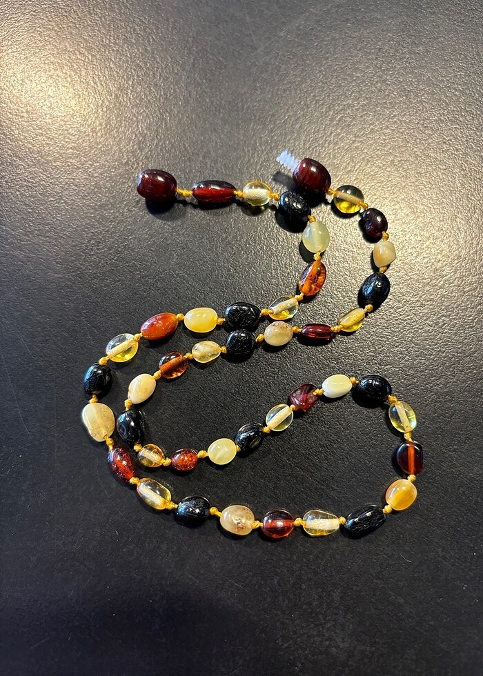 Orjinal Damla Kehribardır. Sağlık açısından birçok faydası bulunmaktadır. Bebeklerde diş çıkarma döneminde ateşi ve ağrıları indirmeye yardımcı olduğu bilinmekte. Yetişkinlerde solunum yolu ve guatr hastalıklarına birçok faydası olduğu bilinmekte. Uzunluk: 37 cm