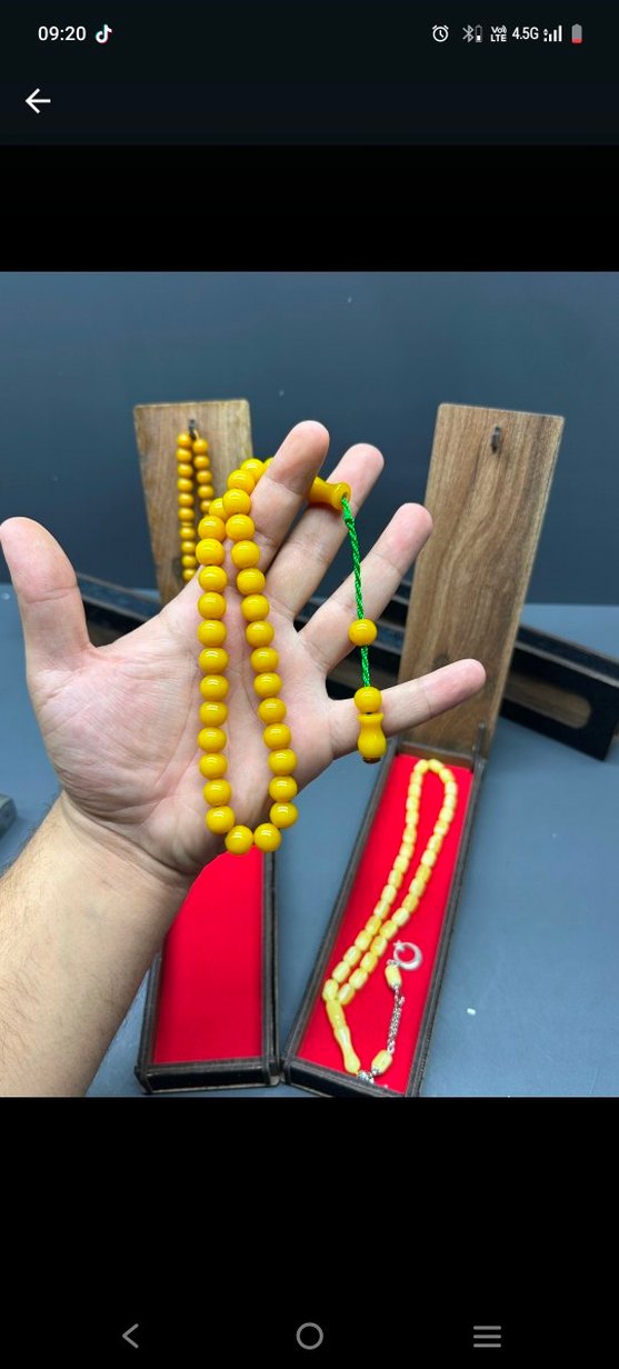 kehribar boncuklardan oluşan, yeşil ipli minimal ve klasik tarzda erkek tesbih. Kırmızı kumaş kaplı ahşap kutuda sunulur.