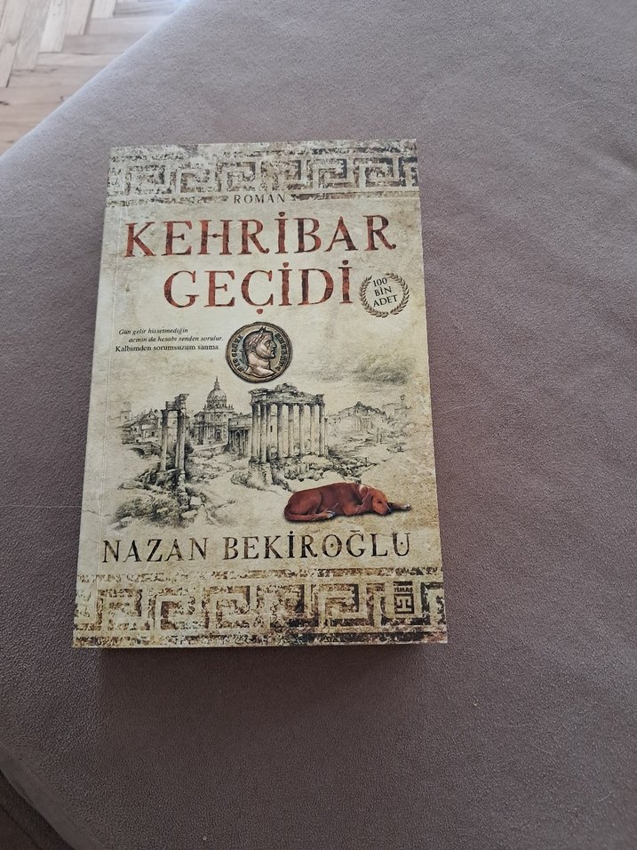 Nazan Bekiroğlu'nun "Kehribar Geçidi" adlı romanı, tarihi temalar ve detaylı anlatımlarla dolu. Kapakta antik kalıntılar ve yatan bir köpek yer alıyor.