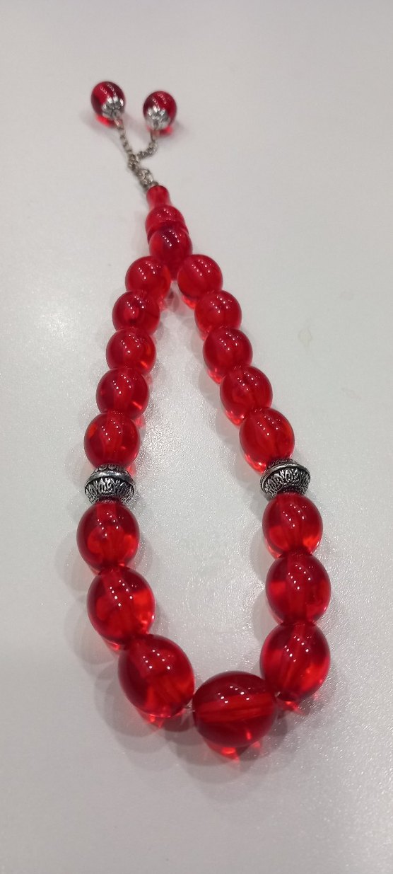 Canlı kırmızı boncuklar ve gümüş detaylarla klasik tarzda erkek tesbih.✨