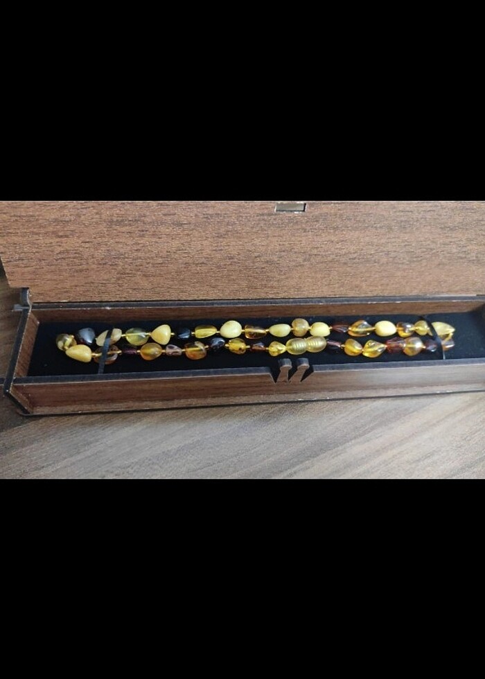 Hediye geldi fakat bizimde kolyemiz olduğundan hic kullanmadık. Özel bir kehribarcıdan satın alınmış. Ahşap kutuludur.