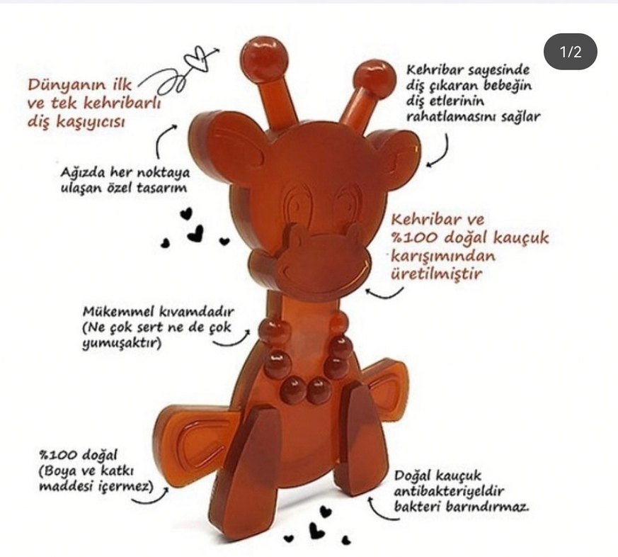 Kehribar ve %100 doğal kauçuk karışımından üretilmiş, bebeğin diş etlerini rahatlatan antibakteriyel zürafa diş kaşıyıcı. Yumuşak ve sert arasında ideal kıvamda, bakteriyel barındırmaz.