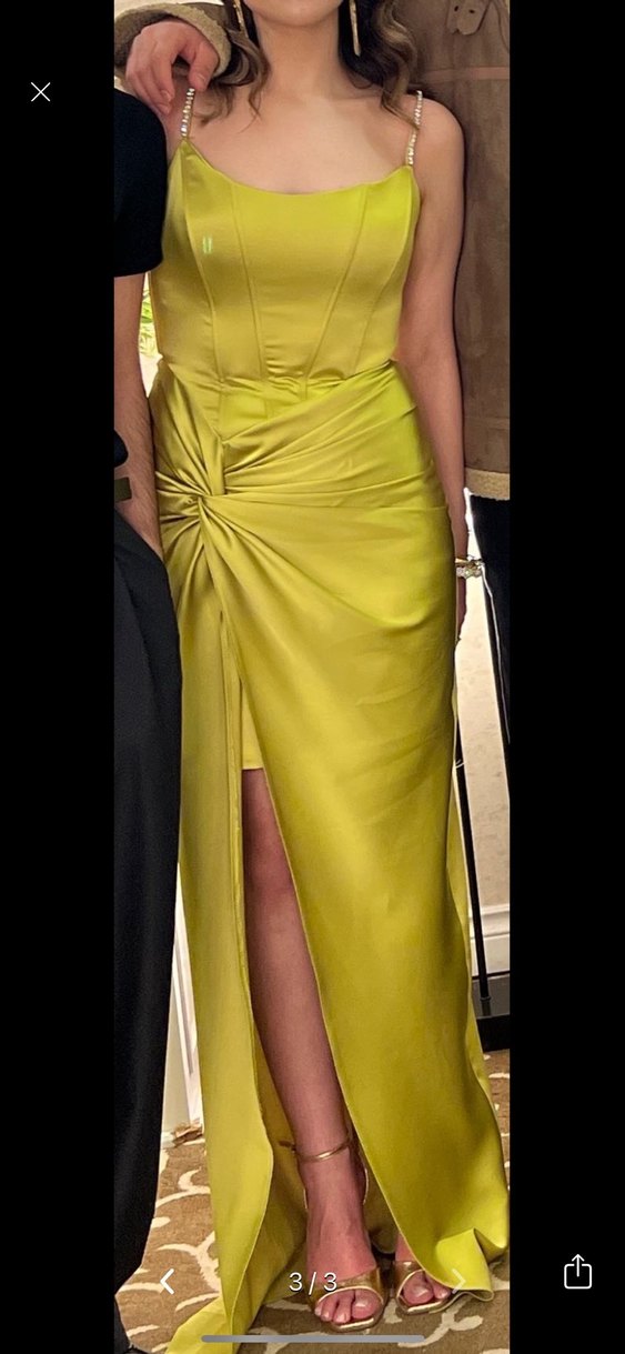 Drapeli ve ön yırtmaçlı, straplez yakalı sarı uzun abiye elbise. Parlak kumaşı ve çağdaş tarzıyla şık düğünlere uygundur.