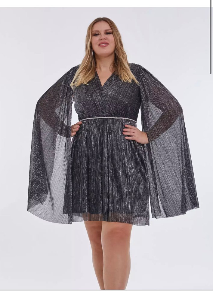 Gri renkte, V yakalı ve drapeli tasarıma sahip mini elbise. Salaş kesim belden oturtmalı ama beli lastikli hiçbir kusuru yok temiz 1 defa düğünde giyildi