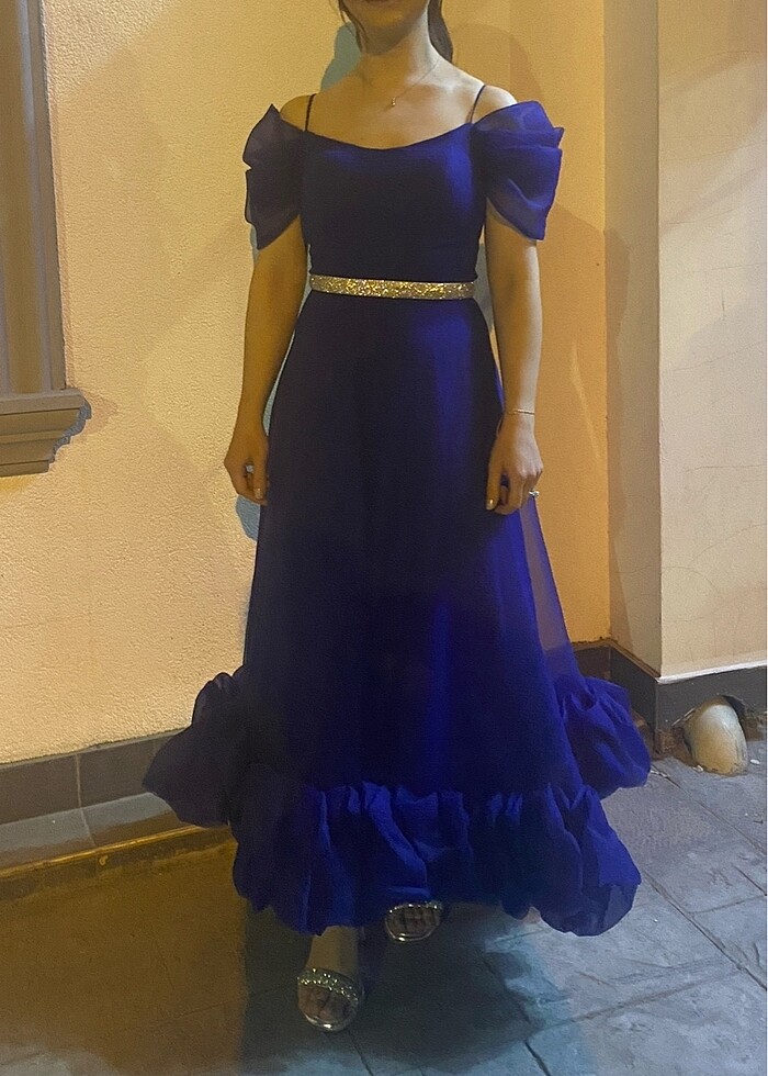Ürün bir kez kullanılmıştır sonrasında kılıfında muhafaza edilmiştir. Kendinden askılıdır, balon kolludur. Beli kemerlidir. Etek ucu bombelidir. Midi boydur.