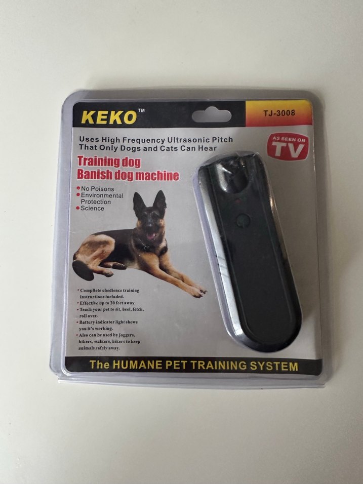 KEKO TJ-3008, köpek ve kedilerin duyabileceği yüksek frekanslı ultrasonik ses çıkaran camel renginde evcil hayvan eğitim cihazıdır. Gürültüsüz ve kimyasalsızdır.