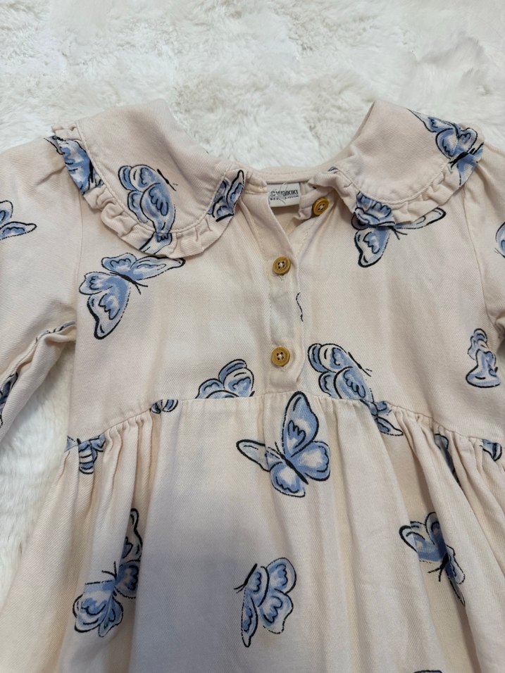 Pamuk kumaştan yapılmış, uzun kollu, yakalı ve bol kesim bej kız elbisesi. Mavi kelebek baskısı ve fırfır detaylarıyla bohem tarzı yansıtıyor.
