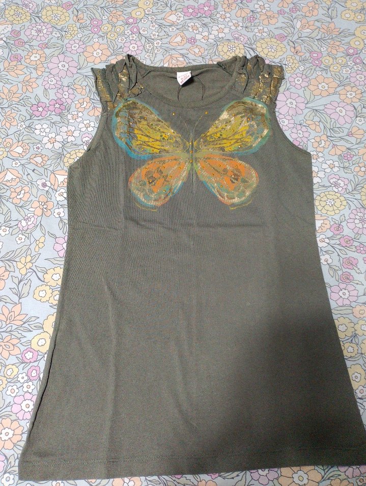 Gri renkte, kelebek baskılı, omuzlarda fırfır detaylı, straplez ve kolsuz kız tişörtü. Yumuşak sentetik kumaştan bohem tarzda üretilmiştir. yeni ürün ölçüleri foto yükledim bakabilirsiniz