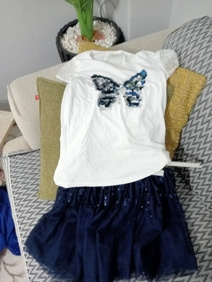 Kelebek baskılı, kısa kollu, bol kesim kız çocuk tişörtü. ve tülü etek Sentetik kumaştan, salaş ve trend bir tarz sunar. Fırfır detaylı ve lacivert tonları