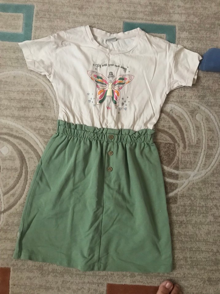 Kısa kollu, yuvarlak yakalı, bol kesim pamuklu kız elbisesi. Beyaz üstü renkli kelebek baskılı, pastel yeşil etek kısmı ve kemer detayı bulunur.