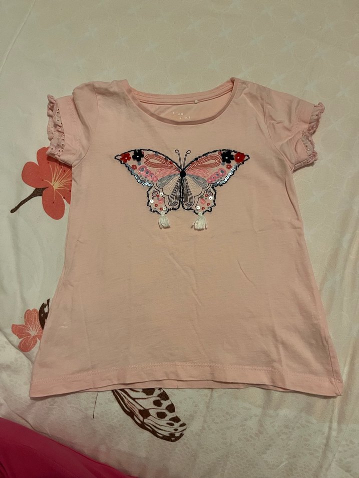 Pembe pastel renkli kız tişörtü, bol kesim ve fırfırlı kısa kollu, yuvarlak yakalıdır. Önünde kelebek baskısı bulunur, sentetik kumaştan üretilmiştir.