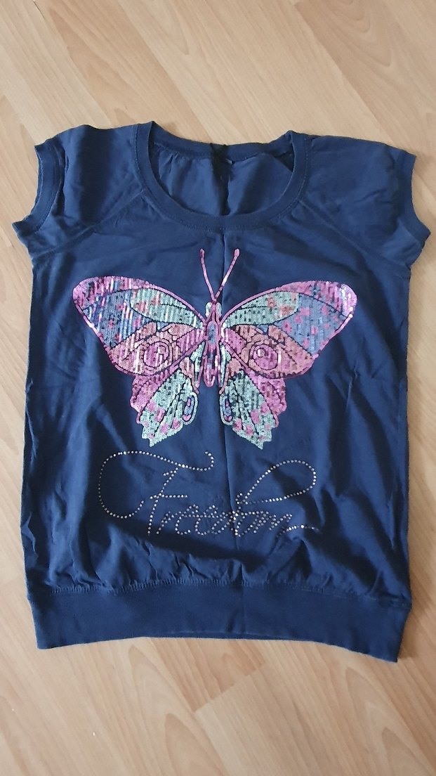 Renkli kelebek baskısı ve pul detaylarıyla, bol kesim mavi kumaştan yapılmış kız tişörtü. Trendy ve rahat sokak stili için uygundur.