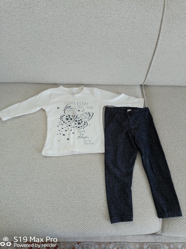Uzun kollu beyaz üstü kelebek baskılı ve simli, koyu renk simli pantolonla tamamlanan bebek kız takımı. Pantolonda çok minik bir sökük vardı,ben diktim,belli bile olmuyor.