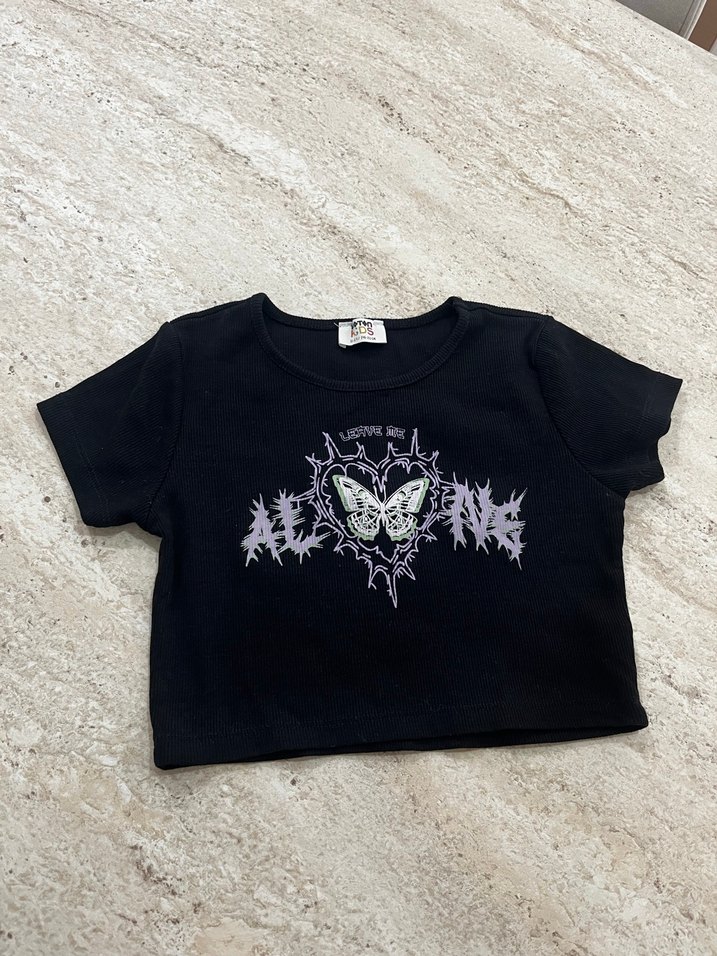 Sentetik kumaştan, kelebek baskılı ve payet detaylı, kısa kollu, siyah, dar kesim bisiklet yaka tişört. Punk rock tarzı için uygun.
