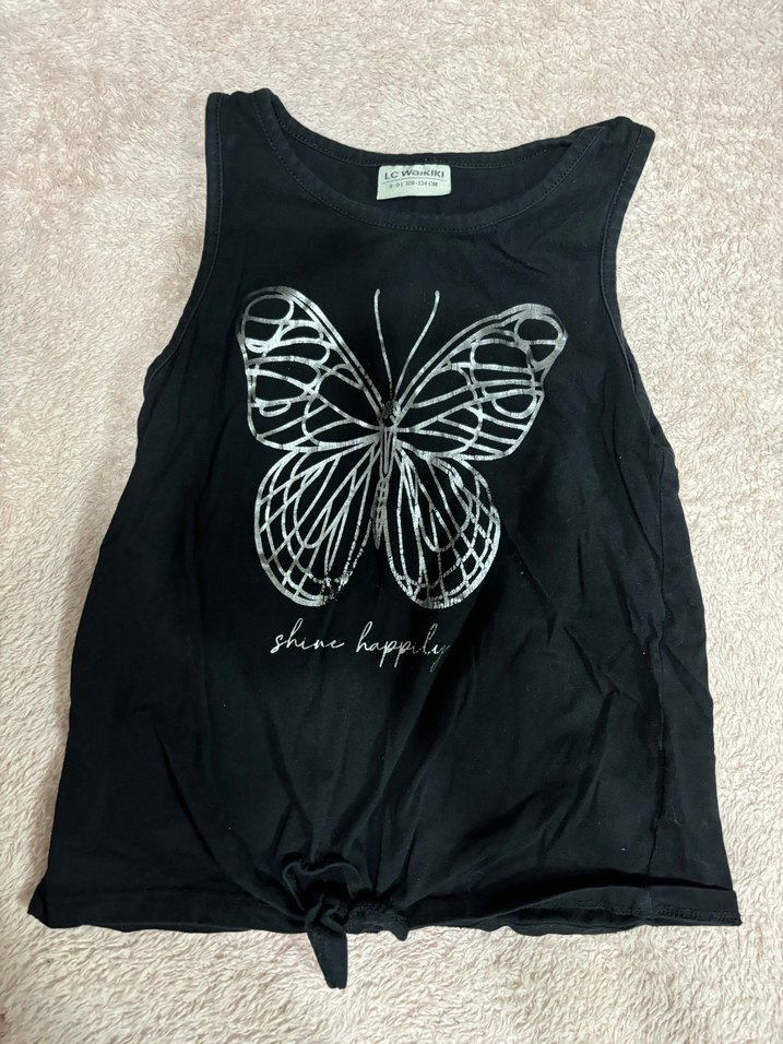 Kelebek baskılı siyah, askısız, kolsuz kız tişörtü. Sentetik kumaştan, bol kesim ve eteğinde fiyonk detayı bulunur.