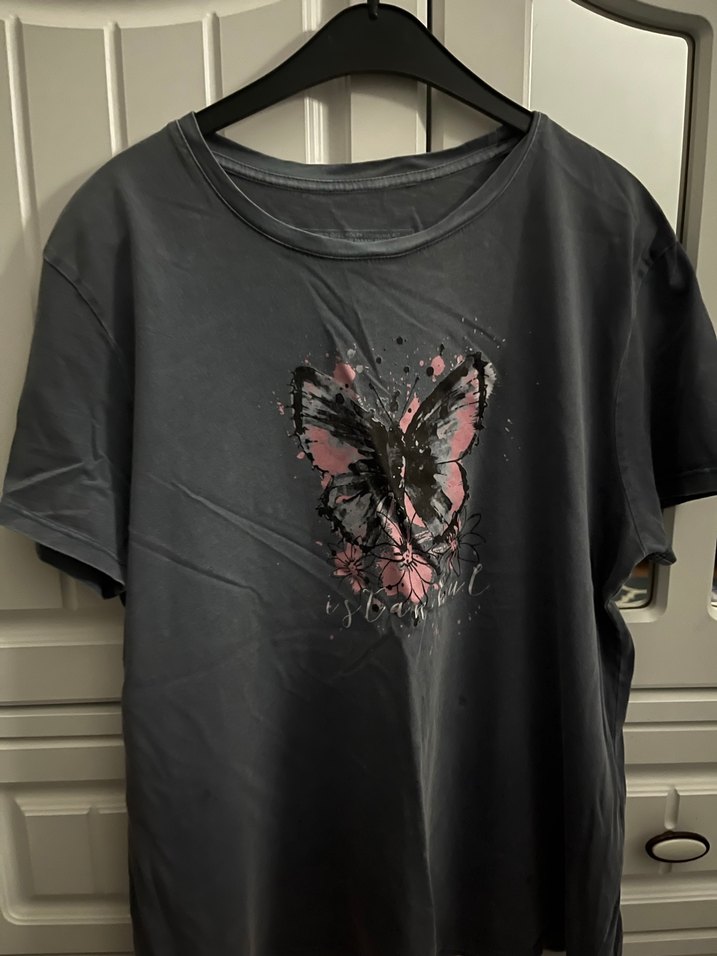 Gri renkte, kelebek baskılı, kısa kollu ve yuvarlak yakalı bol kesim tişört. Rahat ve günlük kullanım için uygundur.