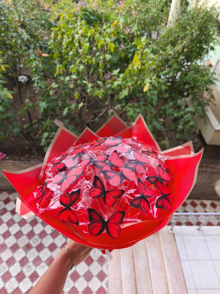 Canlı kırmızı renkte, fiyonk detaylı ve kelebek desenli çiçek i, bohem ve avangart tarzı yansıtıyor.
