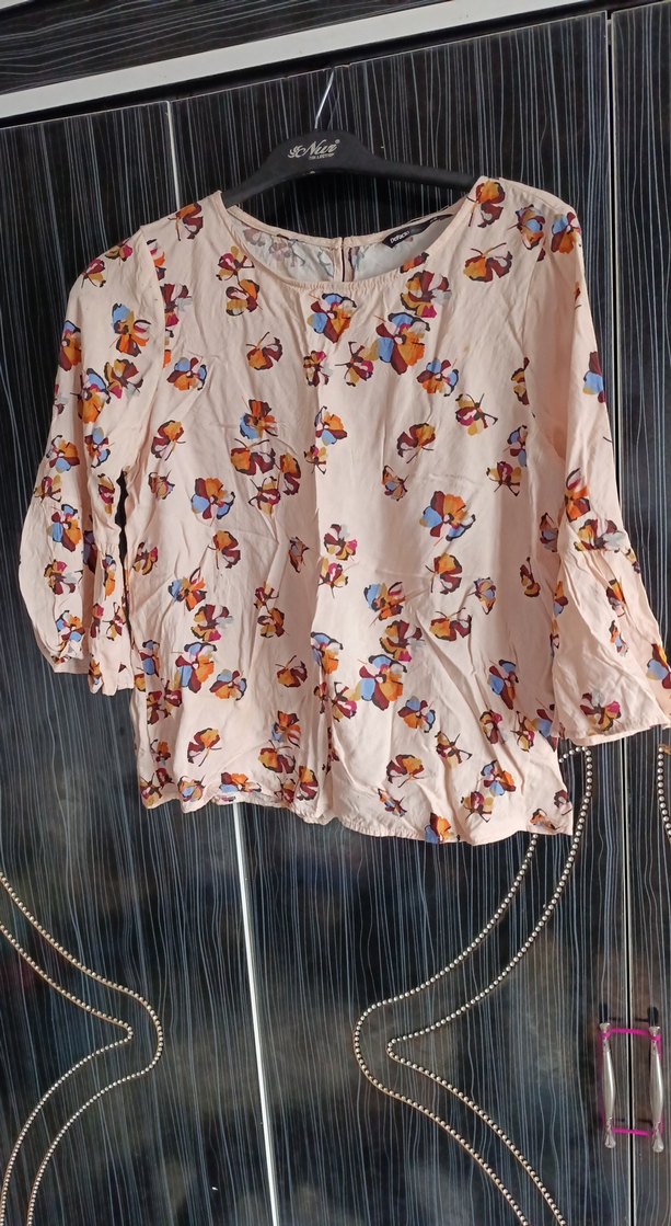 kelebekli Çiçekli uzun kollu, bol kesim kısa bluz. Yumuşak sentetik kumaştan, pastel bej tonlarında çiçekli desenli. Bisiklet yaka, bohem tarzda günlük kullanım için uygun. bazı yerlerde sarı lekeler var minik minik fotolarda göründüğü gibi