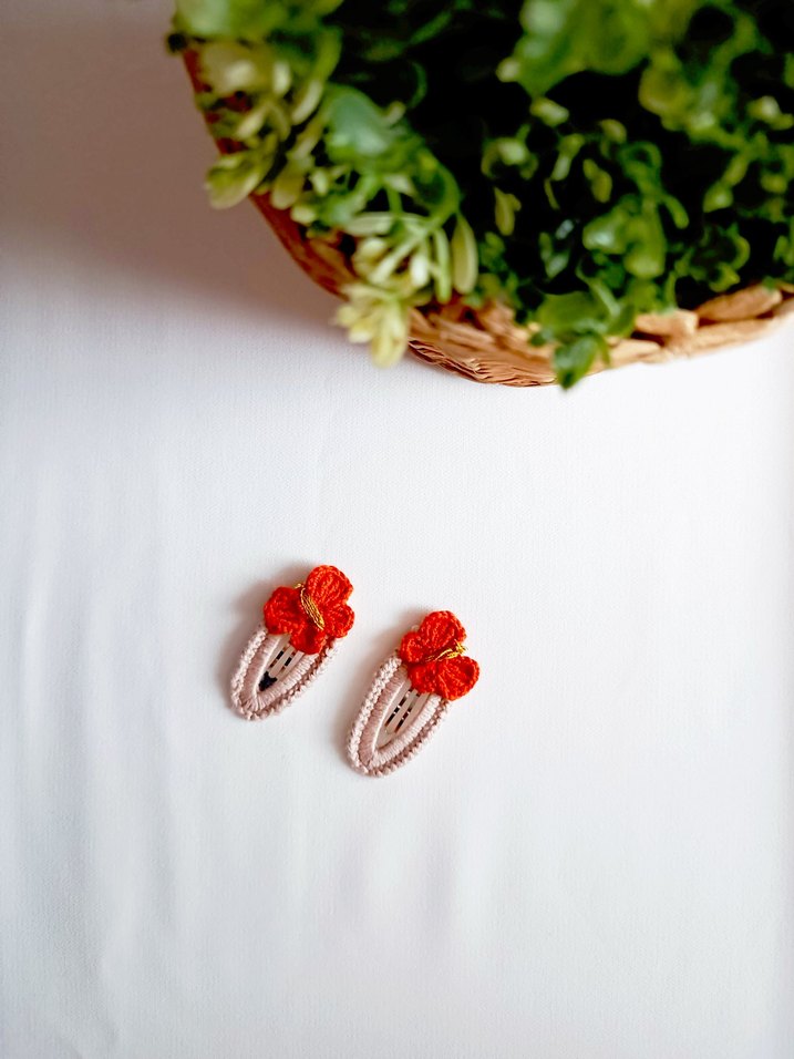 tarçınrengi boncuk ve işlemeli detaylara sahip, renkli bohem tarzda çocuk saç tokaları.