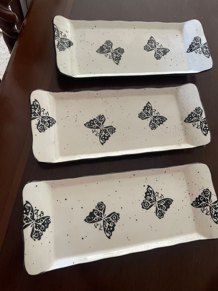 Kelebek desenli siyah baskılı beyaz seramik tepsiler, yiyecek sunumu için uygundur. Her tepsi zarif kıvrımlı kenarlara ve pürüzsüz yüzeye sahiptir.