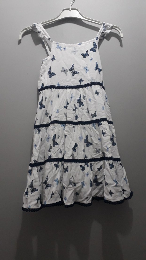 Kelebek desenli, askılı ve straplez yaka kız çocuk elbisesi. Bol kesim ve fırfır detaylarıyla bohem tarzda.