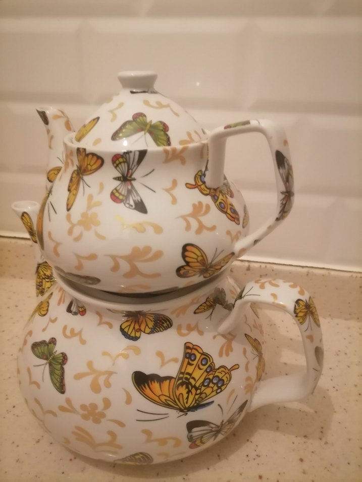 Kelebek desenli, beyaz renkte, üst üste iki parçadan oluşan çaydanlık seti. Alt üst porselen çaydanlık
