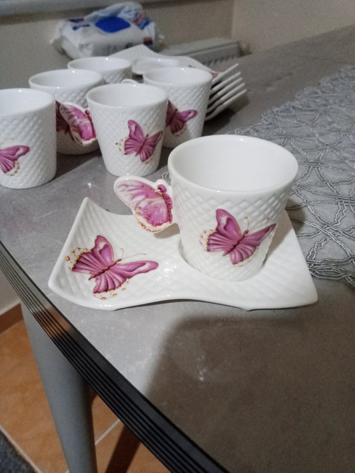 Pembe kelebek desenli dokulu beyaz fincanlar, kare tabaklarla birlikte servis için uygundur hiç bir sıkıntı yok