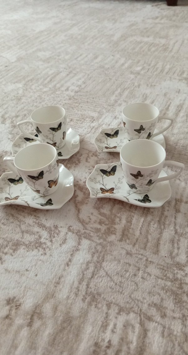 dört lu iki tana tabağı extrdan var Kelebek desenli beyaz kahve fincanı takımı, her fincan ve tabakta uyumlu desenlerle dört parçadan oluşur.