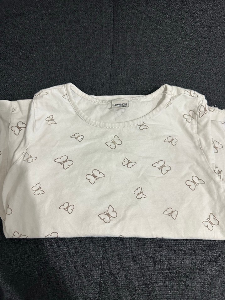 Yumuşak pamuktan, kelebek desenli, yuvarlak yaka ve uzun kollu beyaz kız çocuk tişörtü. Rahat ve bol kesimdir. Kolunda ufak sökük ve leke vardır resimlerde gösterilmiştir.