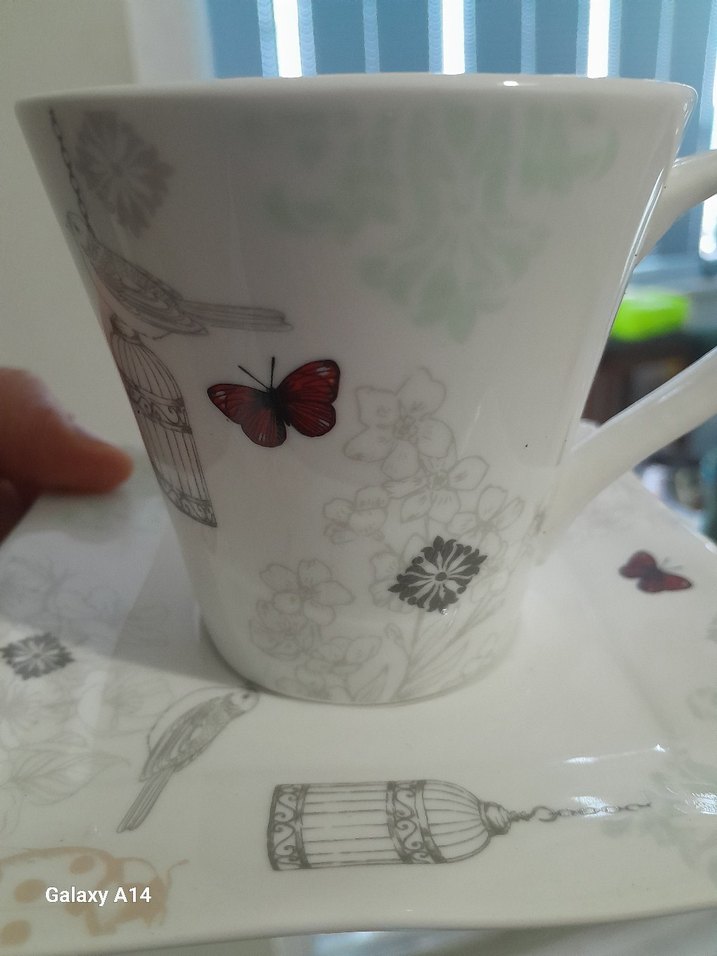 Kelebek ve çiçek desenli, gri tonlarda beyaz porselen fincan. Kare tabak ile birlikte sunulur. hiç kullanılmadı mutfak dolabında duruyor