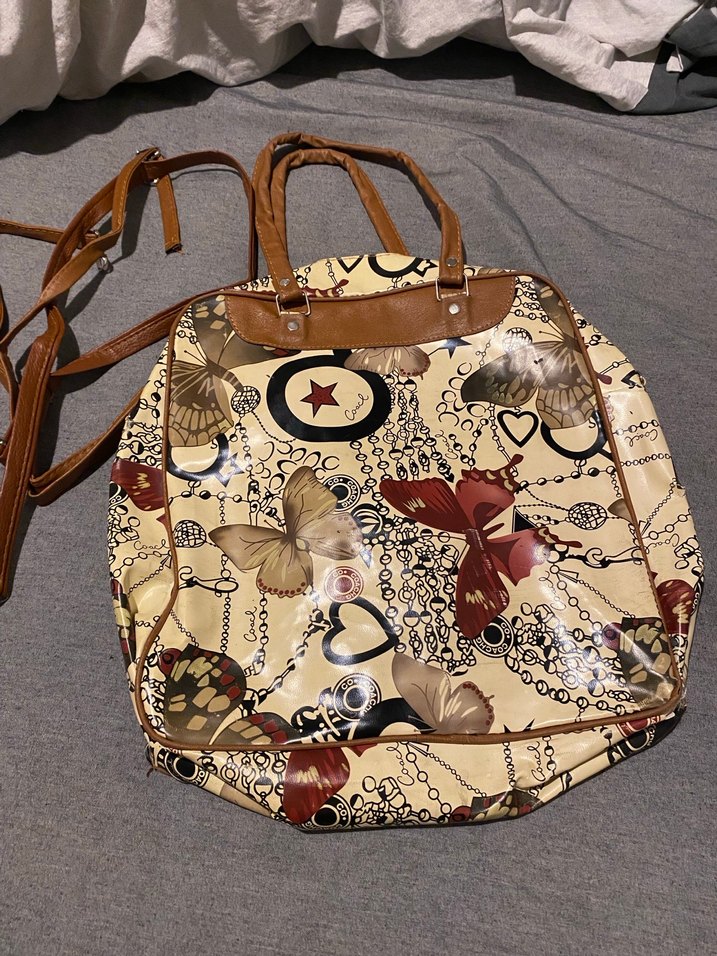Kelebek desenli, açık kahverengi deri çanta, tokalı askılarıyla bohem ve vintage tarzını yansıtıyor. Kusurları resimde gösterilmiştir